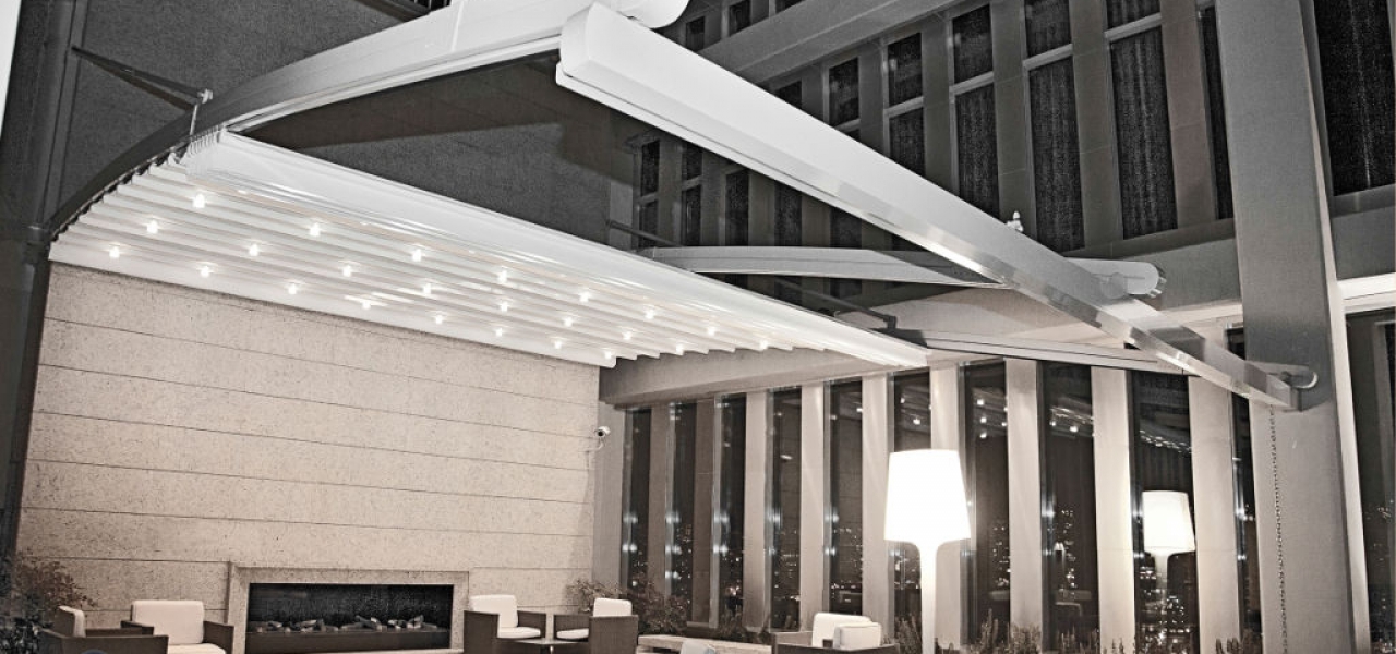 Coral es un sofisticado toldo de pérgola con perfiles de guía curvados. Un sistema novedoso que permite la tensión de la lona en la estética curvada de los perfiles.