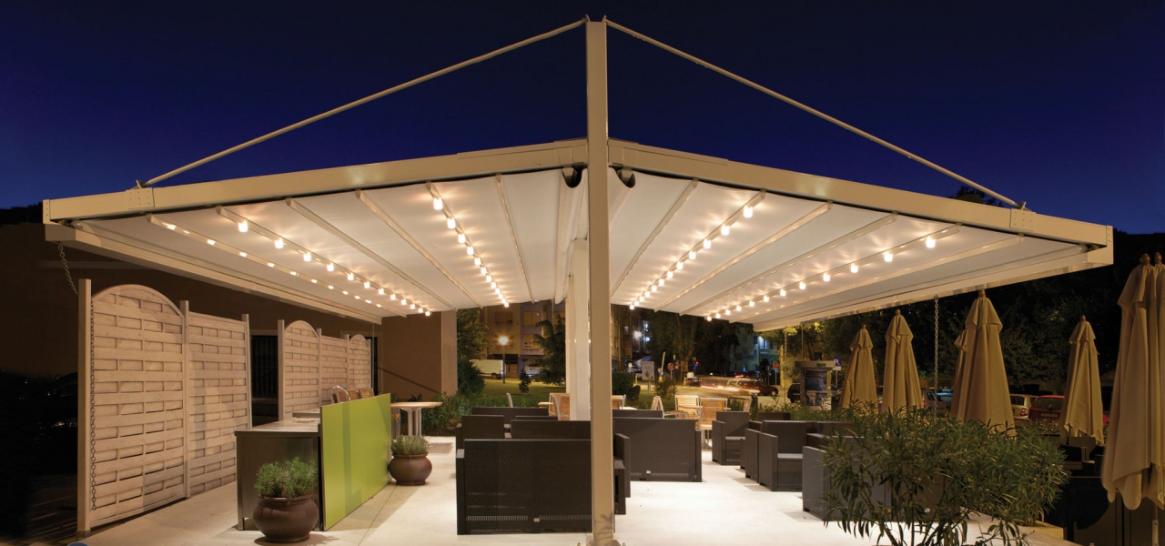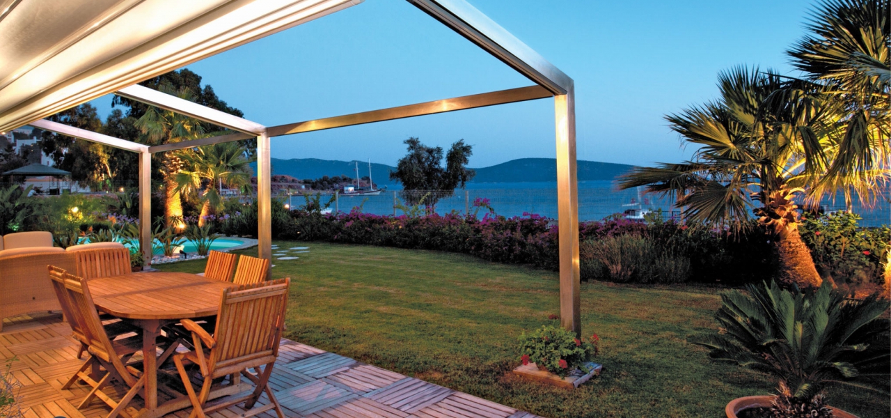 Pavilion es un sistema de techo retráctil de aluminio elegante. Tiene un techo plano con sistemas de drenaje de agua y detalles angulares.
